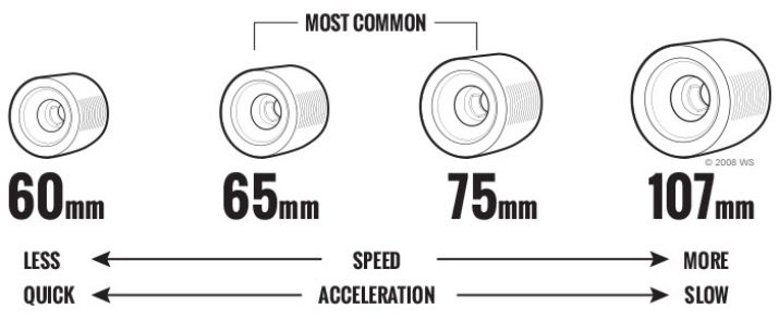Đặc điểm chính của các bánh xe mà bạn cần chú ý khi chọn một tấm ván dài phù hợp là đường kính của chúng. Thông thường được bán có những sản phẩm trong đó bánh xe có đường kính từ 50 đến 100 mm được lắp đặt. Độ cứng của các thành phần cấu trúc này cũng rất quan trọng. Thông số này cũng nên được chọn dựa trên nguyên tắc mà thiết bị được mua.
