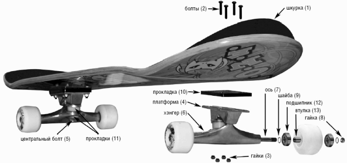 Thiết kế của các tấm ván dài này thường cung cấp các bánh xe có đường kính từ 70 đến 75 cm. Chiều rộng của các rãnh tương ứng với kích thước của mặt cầu. Để có thêm sức mạnh, bu lông được vặn vào đế, khâu các tấm xuyên qua.